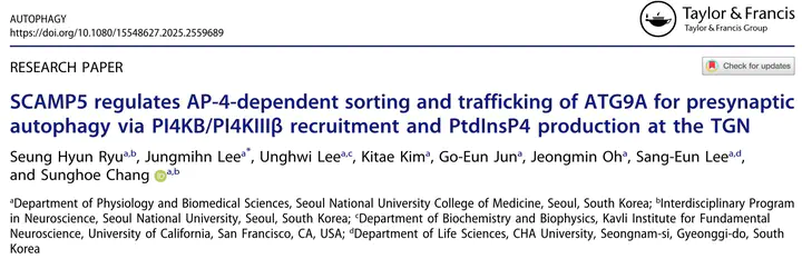 Neuronal autophagosome formation at distant presynaptic sites relies on ATG9A trafficking, a process mediated by AP-4 at the trans-Golgi network (TGN), but the molecular mechanisms governing its sorting for presynaptic delivery have remained elusive. Here, we uncover an unexpected role for SCAMP5, a key regulator of synaptic vesicle dynamics, in orchestrating presynaptic macroautophagy/autophagy through its actions at the TGN. SCAMP5 depletion severely impairs autophagosome formation at presynaptic boutons. Mechanistically, we identify SCAMP5 as a novel binding partner of PI4KB/PI4KIIIβ (phosphatidylinositol 4-kinase beta), where it controls PI4KB recruitment to the TGN and subsequent phosphatidylinositol-4-phosphate (PtdIns4P) production. As PtdIns4P is essential for AP-4 recruitment, SCAMP5 depletion disrupts AP-4-mediated ATG9A trafficking to presynaptic sites, thereby compromising presynaptic autophagy and subsequent protein turnover. Our findings establish that SCAMP5 coordinates ATG9A-dependent presynaptic autophagy through PI4KB recruitment and PtdIns4P production at the TGN, revealing a novel pathway critical for maintaining presynaptic protein homeostasis.